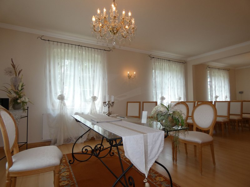 Die Trauung wird in einem in beiger und weißer Farbe mit Laminatfußboden ausgestattetem Trauraum, modern und dennoch stilvoll eingerichtet, mit einer musikalischen Umrahmung durchgeführt. Im Trausaal sind ca. 40 Sitzplätze für Familie und Freunde vorhanden. Im Anschluss an die Eheschließung besteht die Möglichkeit sich in der schönen Grünanlage neben dem Rathaus fotografieren zu lassen.
